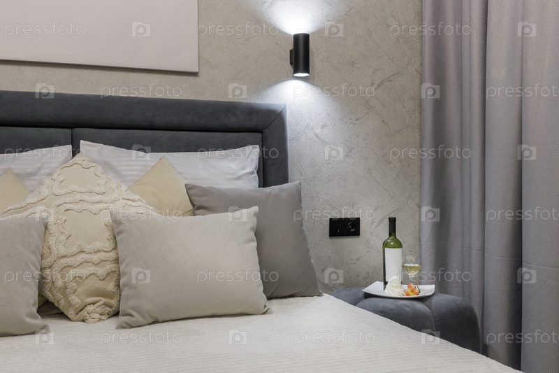 Детализированный снимок современной серой кровати с кремовыми и бежевыми декоративными подушками.Серый османник рядом с кроватью держит бутылку белого вина, бокал и небольшой десерт, создавая радушную атмосферу под мягкой настенной лампой