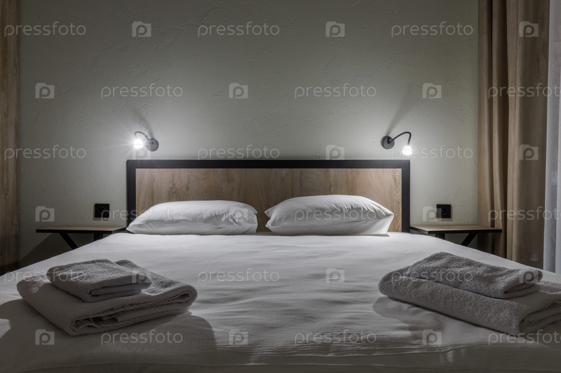 Детали симметричной гостиничной спальни с двуспальной кроватью и лампами для чтения