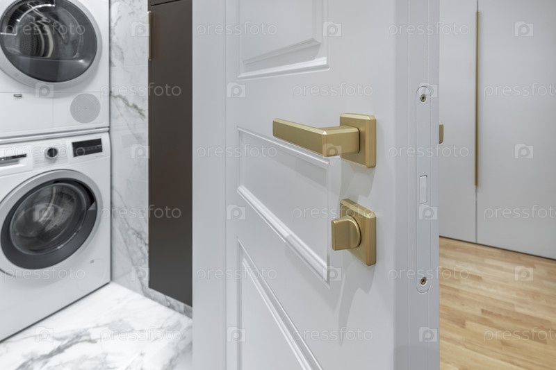 Профессиональный крупный план минималистической белой внутренней двери с гладкой золотой ручкой и замком.На заднем плане раскрывается современная прачечная с наложенной стиральной машиной и сушилкой на мраморных плитках, а также вид коридора с дубовыми по