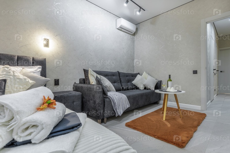 Широкий интерьер современной квартиры-студии с серым туфтовым диваном с декоративными подушками и белой текстурированной кроватью.Минималистский круглый стол содержит вино и десерт на фоне блестящих серых стен и черного освещения трассы