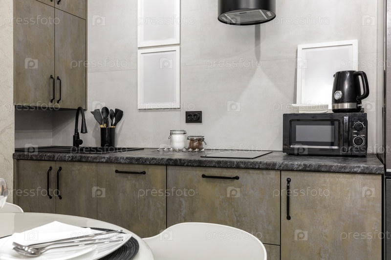 Ближайший снимок современной кухни с оливково-серой камней эффектом шкафа с черными ручками, темным гранитным столешницей и черным раковиной.Зона оснащена микроволновой печью, чайником и минималистическими белыми рамками на серой плиточной стене