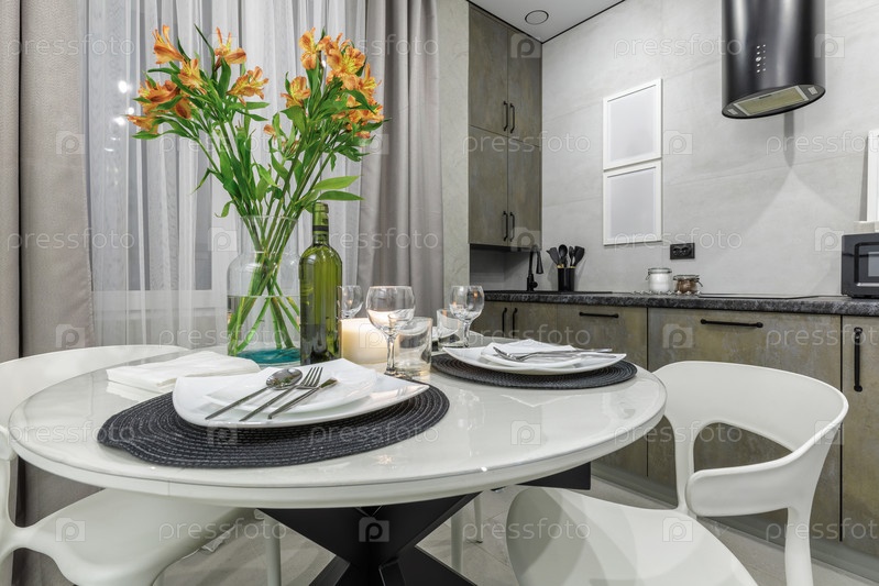 Детальный интерьерный снимок белого круглого обеденного стола, красиво убранного тарелками, вином и свечой.Стеклянная ваза с ярко-оранжевыми цветами служит центральным элементом, на фоне современной кухни и мягких серых штор