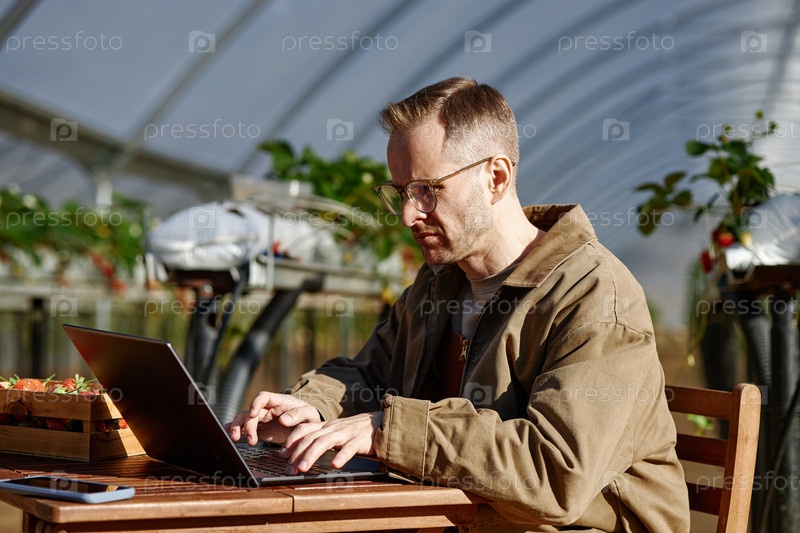 Кавказский мужчина средних лет, использующий ноутбук во время работы в теплице