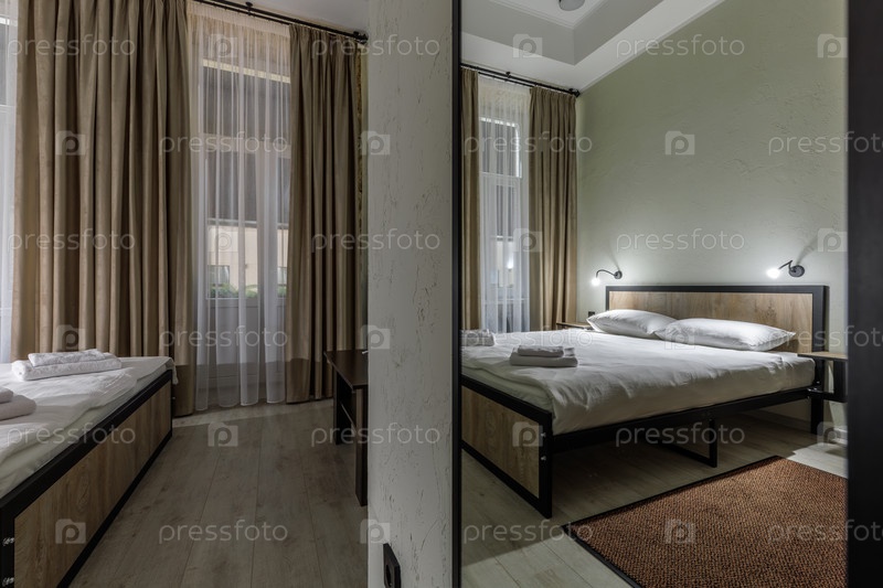 Современный минималистский гостиничный номер с деревянной двуспальной кроватью, прикроватными лампами и коричневым ковром.Снимки включают настенное зеркало, отражающее постель и окно бежевыми шторами.Чистый функциональный интерьер для бюджетных поездок