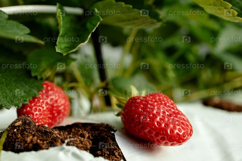 Свежие клубники, растущие на растении в саду во время сезона сбора урожая