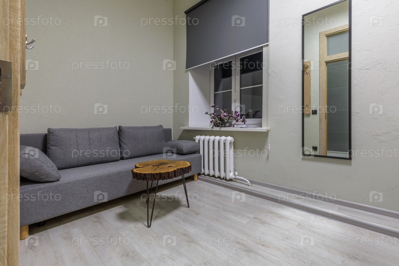 Профессиональный снимок интерьера функциональной бюджетной комнаты. Имеет серый диван-кровать, кофейный стол с деревянными плитами и большое стеновое зеркало. Чистый минималистический дизайн с окном и радиатором, идеально подходит для краткосрочного город