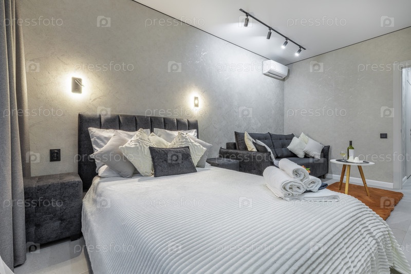 Современная квартира-студия с элегантной кроватью и уютным салоном