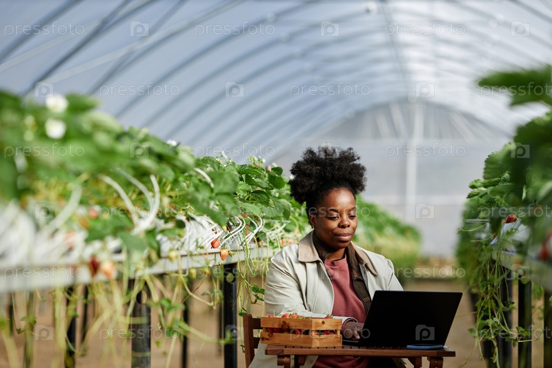 Молодая взрослая чернокожая женщина использует ноутбук во время работы в теплице