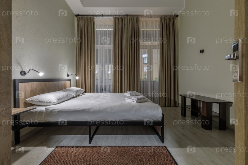 Минималистский гостиничный номер с двуспальной кроватью с белым постельным бельем, прикроватными лампами и коричневым ковром.Снятие включает в себя переднюю дверь со смарт-замком и небольшой деревянной скамейкой.Функциональный интерьер для бюджетного горо