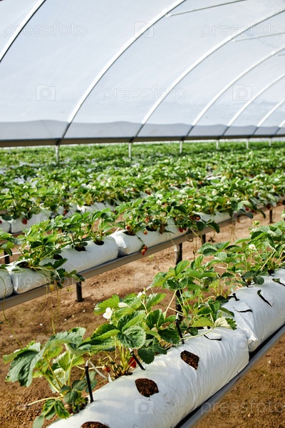 Растения клубники созревают внутри гидропонической теплицы во время вегетационного сезона