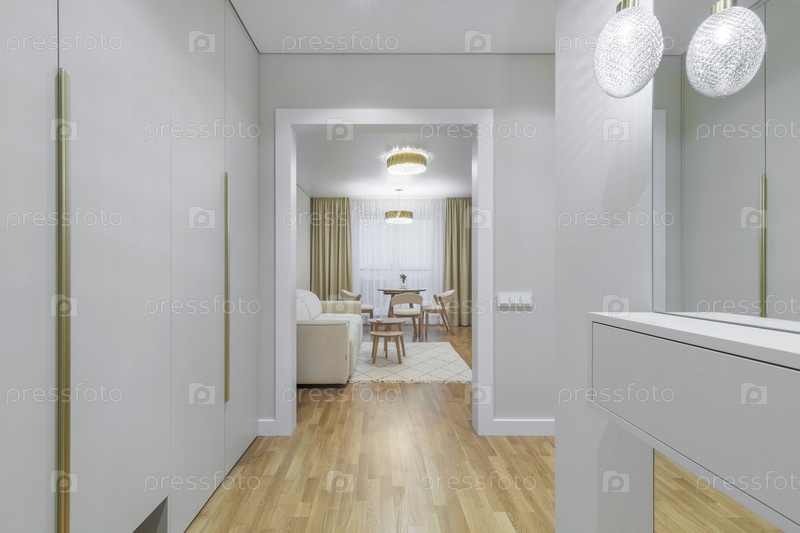 Сцена имеет белые встроенные шкафы с длинными золотыми ручками, большое настенное зеркало с дизайнерскими лампами и открытую дверь, ведущую к яркой гостиной с диваном и столовой