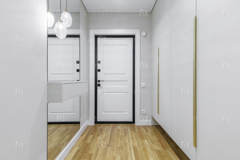 Профессиональный снимок яркого минималистского входа.Отмечает белый встроенный гардероб с золотыми ручками, большое стеновое зеркало с дизайнерскими лампами и белую переднюю дверь с черной отделкой на дубовом паркете.Чистый и просторный дизайн