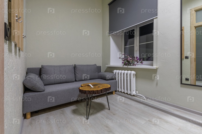 Профессиональный снимок интерьера минималистической гостевой комнаты. С серым диваном-кроватью, уникальным деревянным кофейным столом с живым краем и окном с темными жалюзи. Простое и функциональное размещение для городских путешественников и бюджетных го