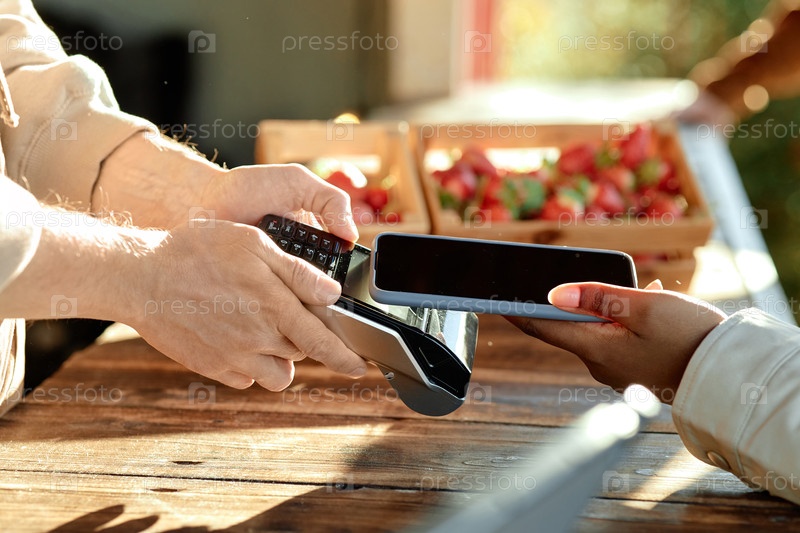 Кавказский мужчина принимает мобильные платежи от чернокожей женщины на открытом рынке