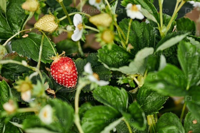 Зрелая клубника растет среди зеленых листьев и цветущих цветов на открытом воздухе