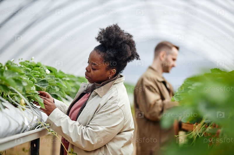 Молодая черная женщина и белый мужчина собирают клубнику в теплице