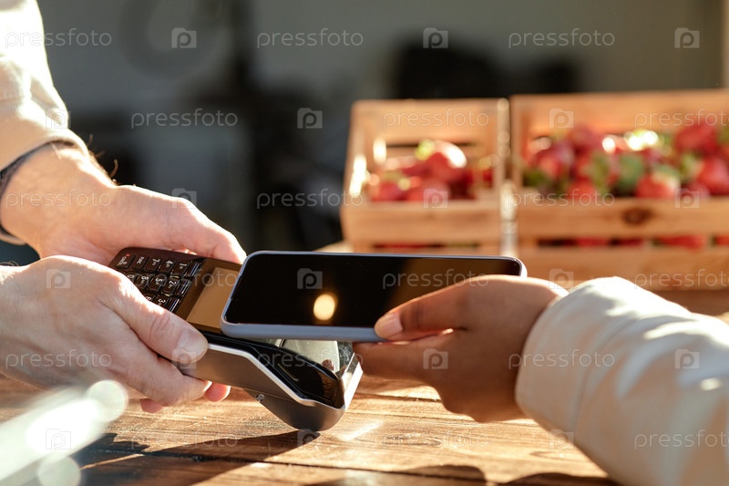 Молодая взрослая чернокожая женщина делает бесконтактные платежи с помощью смартфона