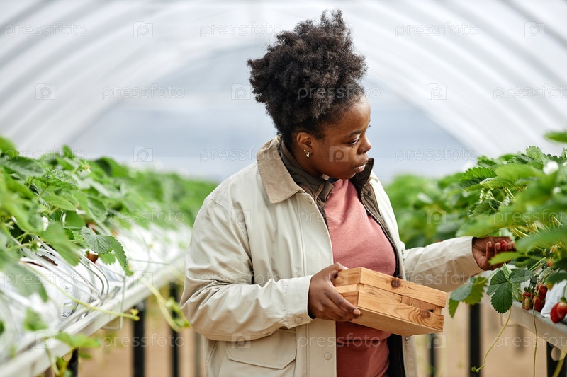 Молодая чернокожая женщина собирает клубнику в теплице с деревянной коробкой
