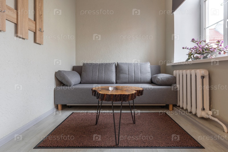 Современная гостиная в минималистическом номере с диваном из серой ткани, деревянным столом для кофе и коричневым ковром. включает окно с растением и стеновую стойку для пальто. чистый функциональный дизайн для городского проживания