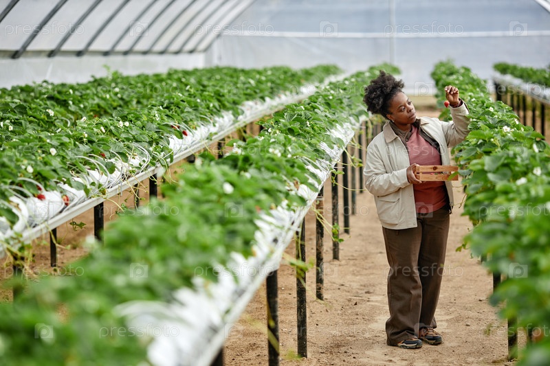 Молодая взрослая чернокожая женщина изучает созревающую клубнику в крытой теплице
