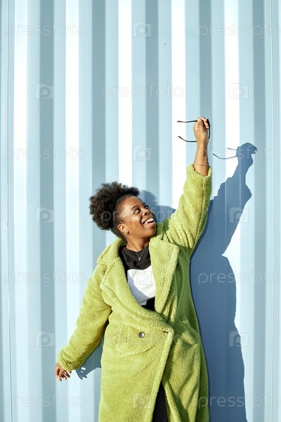 Молодая взрослая черная женщина улыбается и держит солнцезащитные очки на синей стене