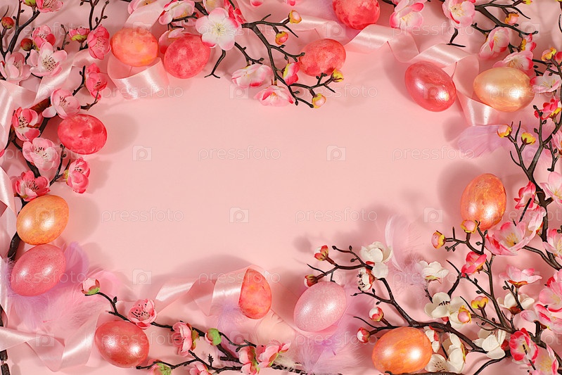Абстрактная пасхальная композиция с окрашенными яйцами на элегантном кухонном столе в окружении весенних вишневых цветов. Концепция "Счастливого Пасхи"