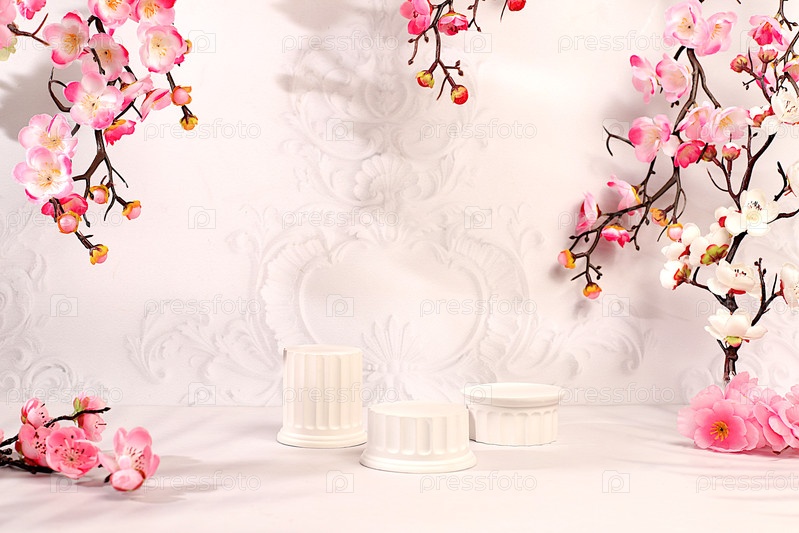 Элегантный солнечный красочный баннер, фон с розовыми цветами сакуры для дизайна. Пустой красивый весенний подиум и шаблон для вашего творчества, стенд продуктовой выставки и концепция летней вечеринки