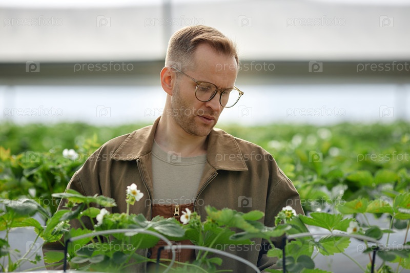 Кавказский молодой взрослый мужчина осматривает клубничные растения в теплице