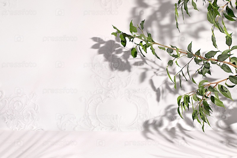 Пустой подиум для демонстрации косметики, установленный на элегантном, солнечном и красочном фоне с тенями тропических пальм. Идеальный шаблон для вашей творческой работы - концепция летней вечеринки