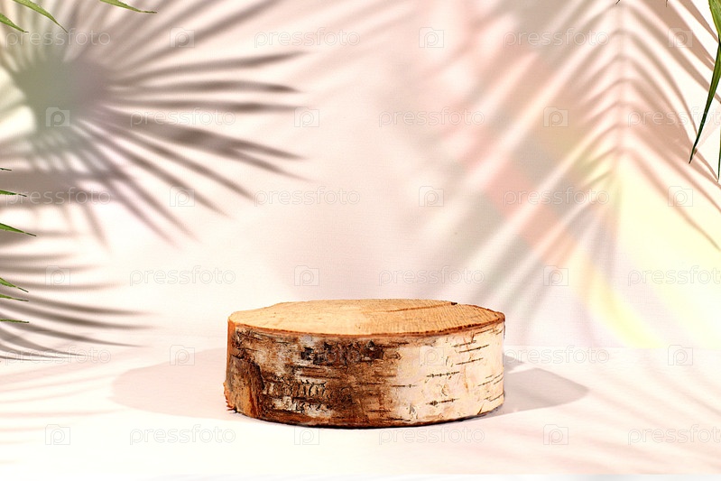 Пустой березовый подиум для демонстрации косметики, установленный на элегантном, солнечном и красочном фоне с тенями тропических пальм