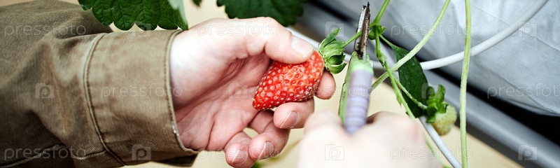 Кавказский молодой взрослый мужчина собирает спелую клубнику в гидропонном саду