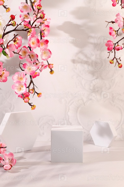 Абстрактный художественный минималистский фон для презентации косметической продукции, премиальный пустой подиум с ветвями вишневых цветов на солнечном элегантном фоне, шаблон дизайна и баннер для экрана