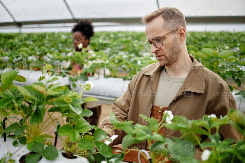 Кавказский молодой взрослый мужчина собирает клубнику в теплице с черной женщиной