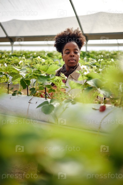 Молодая взрослая чернокожая женщина наблюдает за развитием клубники в теплице
