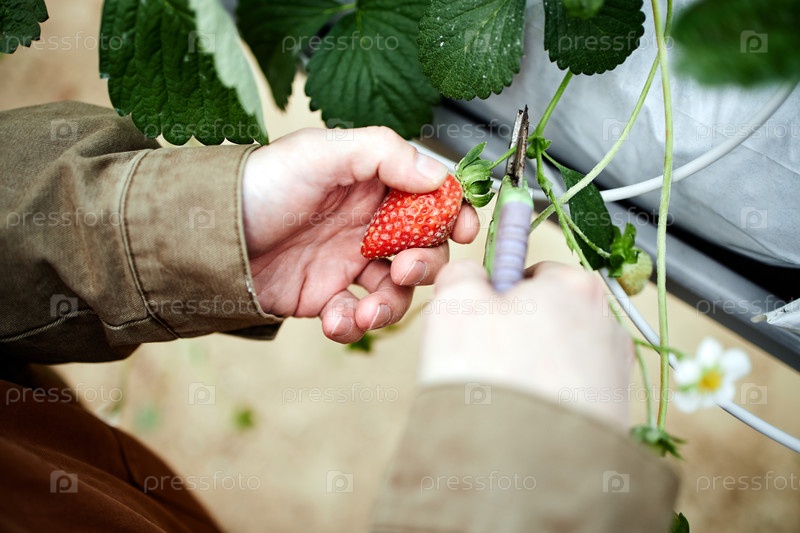 Человек, собирающий спелую клубнику в теплице