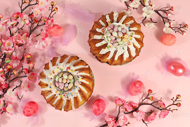 Абстрактная пасхальная композиция с традиционным русским меренгом куличем и украшенными яйцами на элегантном столе кухни со весенними вишневыми цветами.Концепция "Счастливого Пасхи".Экранный баннер