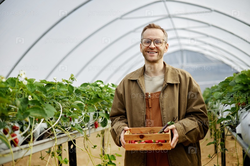 Портрет молодого взрослого белого мужчины, собирающего клубнику в теплице