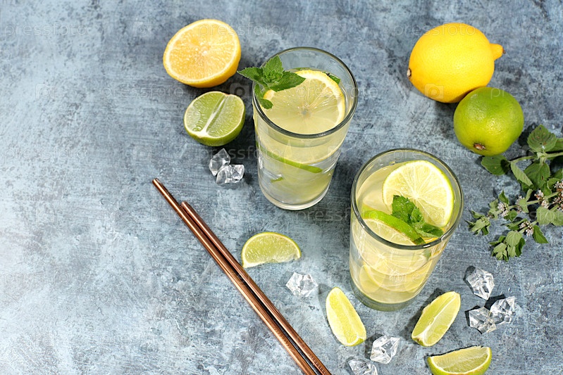 Концепция детоксикационной диеты и здорового образа жизни, Летний напиток с лимоном, мятой, лаймом и апельсином на легком столе, мохито или коктейль улучшают метаболизм и способствуют потере веса, реклама летней вечеринки