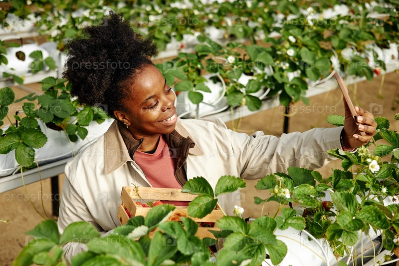 Молодая взрослая чернокожая женщина делает селфи, собирая клубнику в помещении