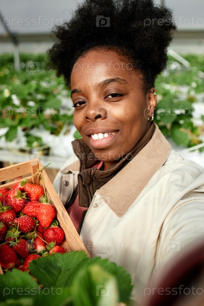 Портрет молодой взрослой чернокожей женщины, улыбающейся в то время как она держит корзину клубники