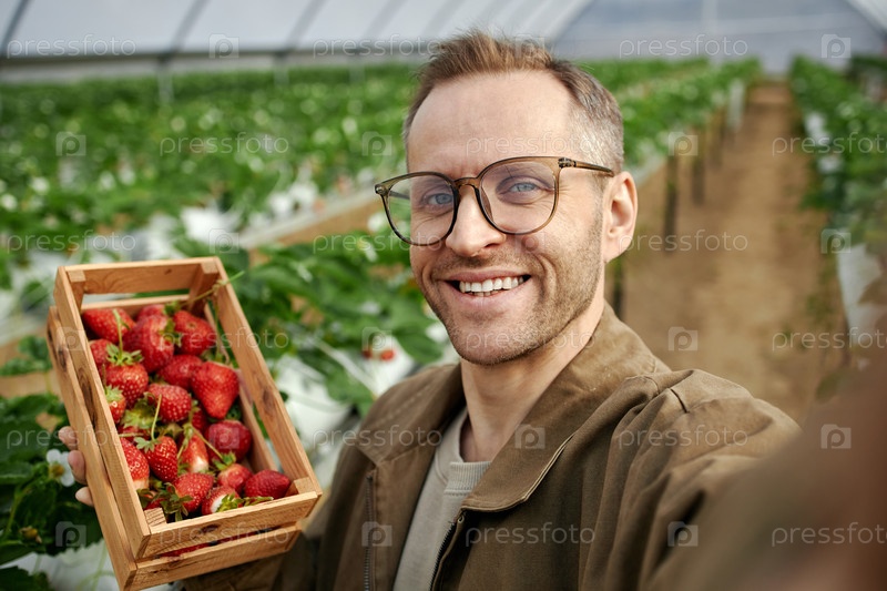Портрет взрослого белого мужчины, улыбающегося, показывая урожай клубники