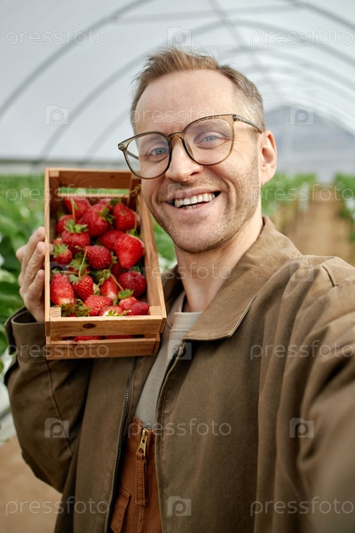 Портрет молодого взрослого белого мужчины, держащего клубнику и улыбающегося в помещении