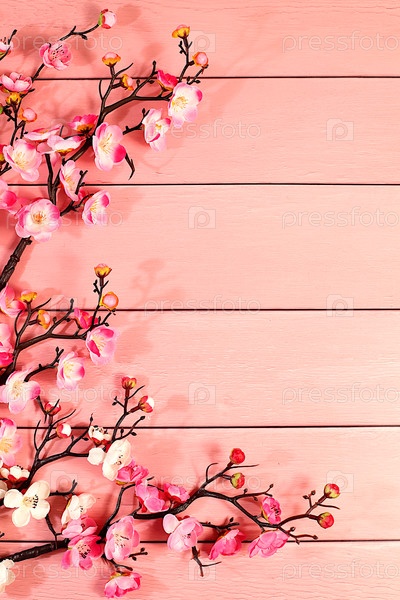 Абстрактная весенняя цветовая аранжировка с розовыми ветвями сакуры на солнечном фоне, элегантный красочный баннер и шаблон для вашей творческой работы, концепция приезда весны, открытка с пространством для текста