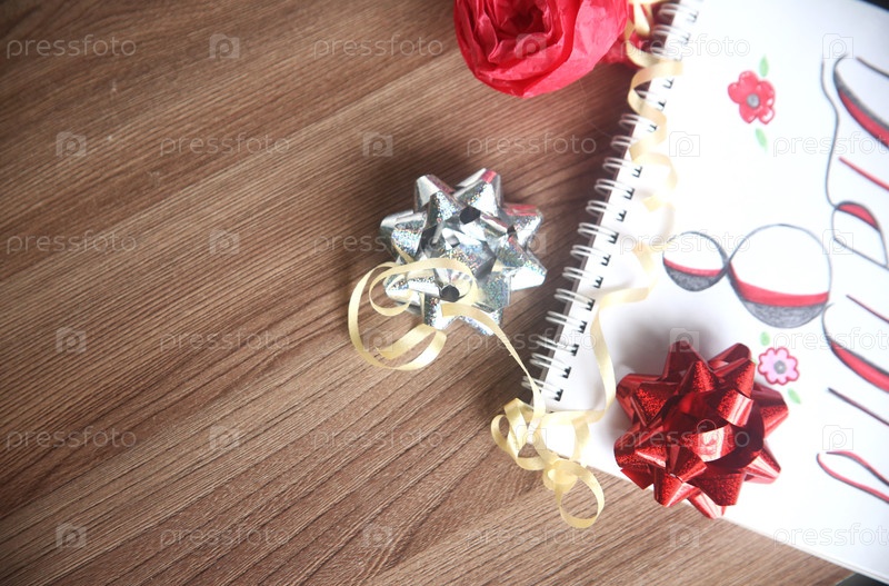 Красный и серебряный блестящие банты с ленточкой крупным планом на столе