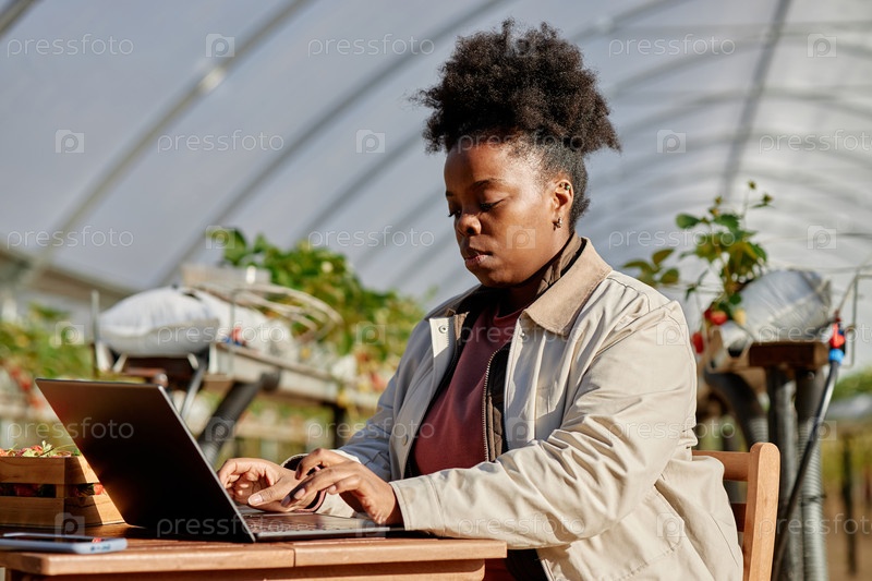 Молодая взрослая чернокожая женщина использует ноутбук во время работы в современной теплице