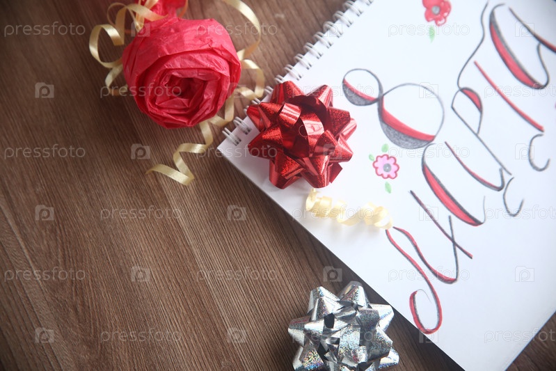 Красный и серебряный блестящие банты с ленточкой крупным планом на столе