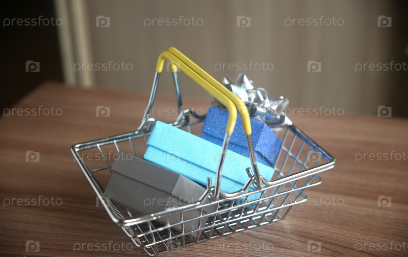 Металлическая корзина с подарочными коробками на деревянном столе крупным планом