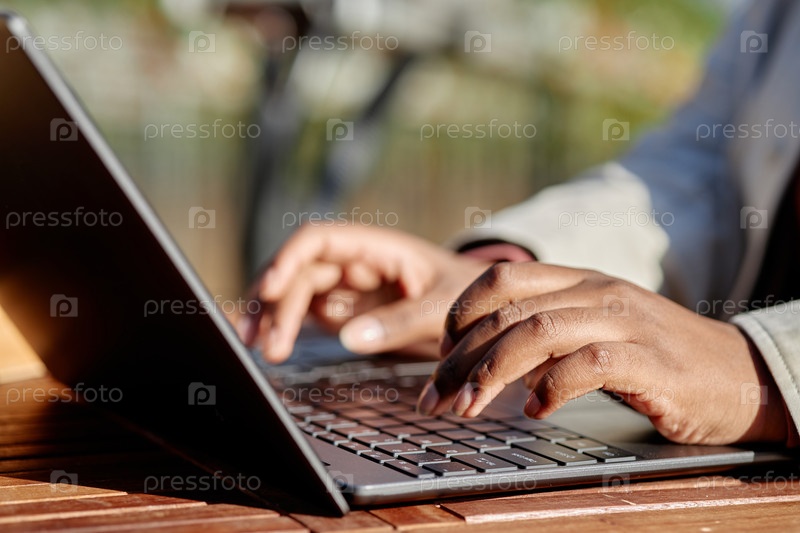 Молодая взрослая чернокожая женщина печатает на ноутбуке в открытом воздухе при дневном свете