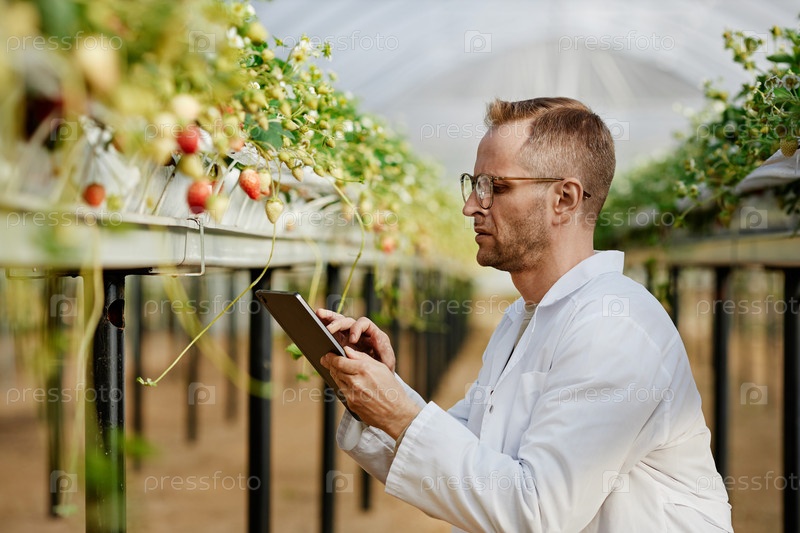 Кавказский молодой взрослый мужчина использует цифровой планшет во время осмотра клубниковых растений