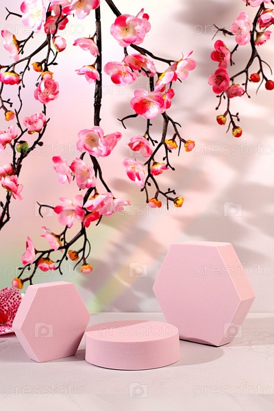 Абстрактный художественный минималистский фон для презентации косметической продукции, премиальный пустой подиум с ветвями вишневых цветов на солнечном элегантном фоне, шаблон дизайна и баннер для экрана